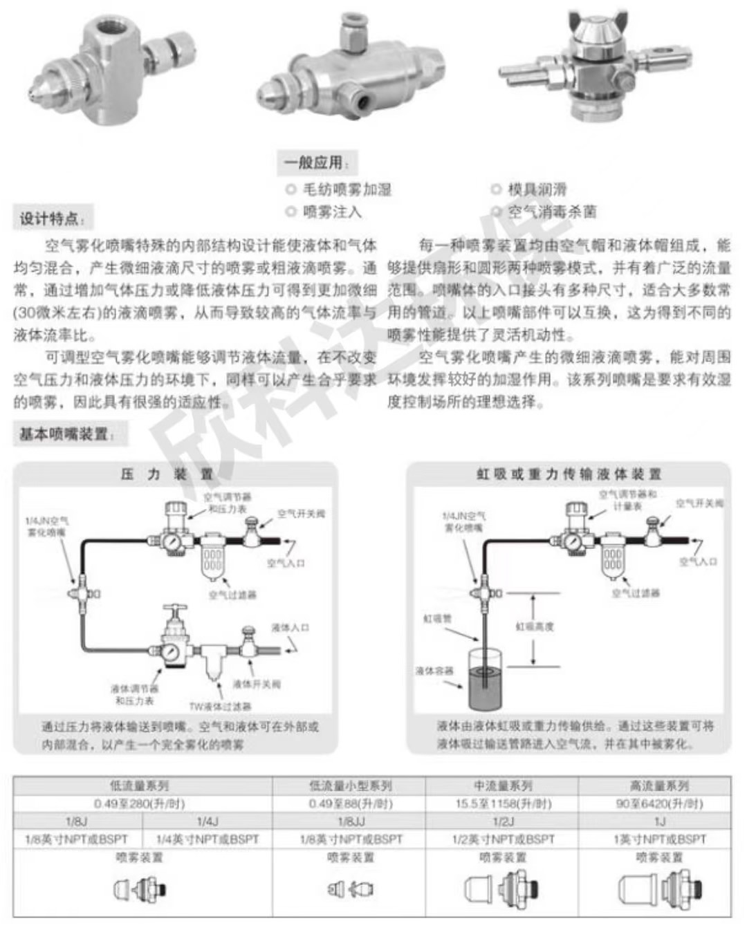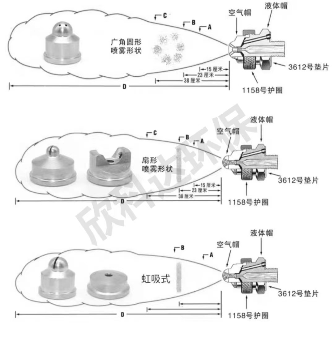 1.每个系列都提供压力喷雾装置或虹吸喷雾装置。2.每个喷雾装置都能提供一个特定的喷雾形状,流量和喷雾覆盖范围。3.喷雾装置可以在不同的喷嘴系列中相互更换。4.圆形喷雾: 延展的实心锥形圆形喷雾。5.广角圆形喷雾:空心锥形,广角圆形喷雾。6.360°环形喷雾:空心锥形,360°环形喷雾。7.扇形喷雾:延展的扇形和片形喷雾。8.偏转扇形喷雾:延展的扇形和片形喷雾,偏离入口接头轴线而喷出。9.每个喷雾装置包括一个空气帽和一个液体帽。